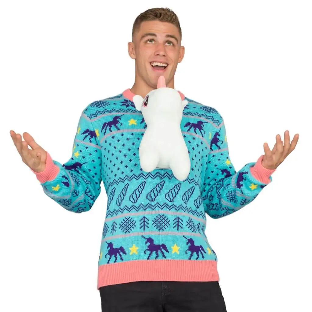 This Christmas season we wanted to do something different. Hence, we’ve created ugly 3-D Christmas sweaters. And what’s uglier? A Stuffed Unicorn. Yes, we’ve made an ugly 3-D stuffed Unicorn Christmas sweater – and when you wear it, you’ll feel as tipsy as one of Santa’s elves who’s been experimenting too much with unicorn poo.