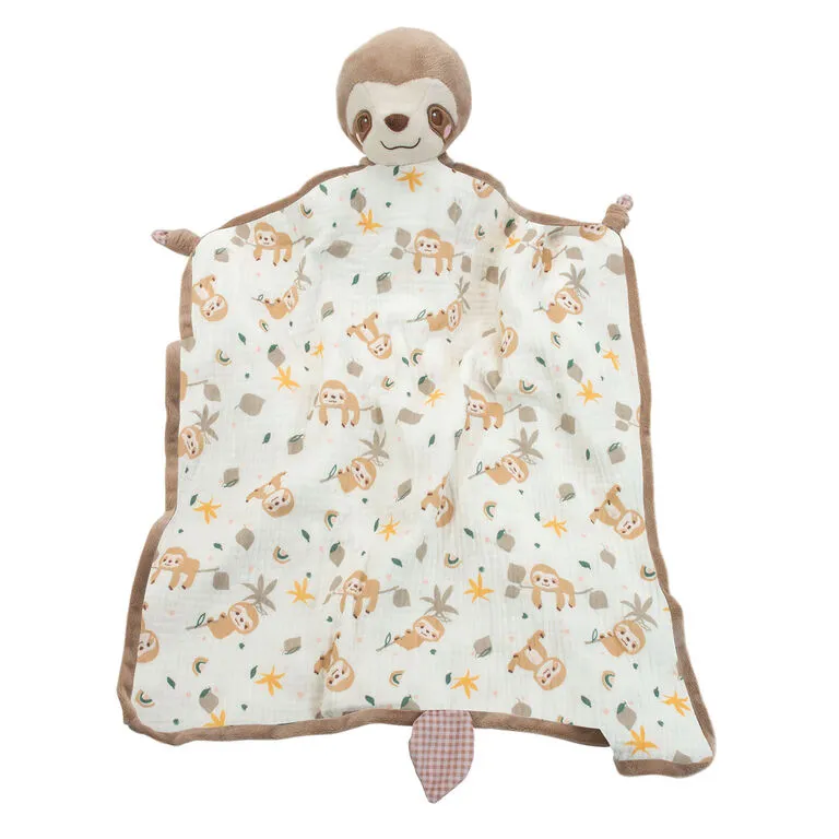 - Baby blanket with plush sloth head features double-sided cotton muslin with plush accents.