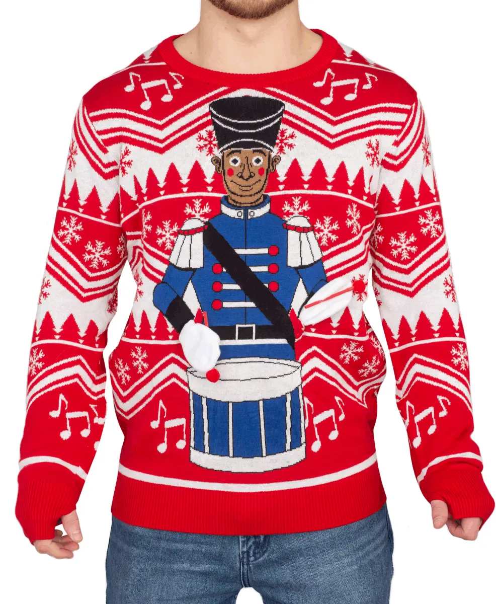 Make yourself stand out in a crowd of crazed ugly Christmas sweater lovers when you show up to your next ugly Christmas sweater party wearing this insane Flappy Drummer Boy Animated Ugly Christmas sweater. (Not to mention, feel as tipsy as one of Sant’s elves.) With our special technology at work, now you can have a special cartoon little Drummer Boy banging on the drums on your sweater automatically when you wear this ugly Drummer Boy Christmas sweater. With arms that inflate and automatically move around while you’re wearing it, this ugly Christmas sweater proves to everyone that you yourself dance to the beat of a different drummer. Going fast, get yours today!