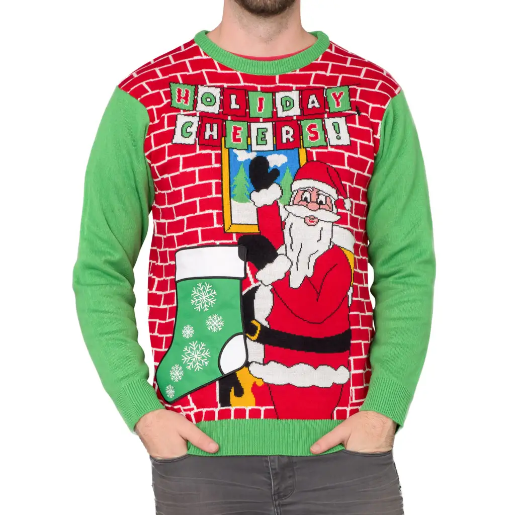 There are ugly Christmas sweaters, and then there are tacky ugly Christmas sweaters, and then there is the latest trend: the gaudy ugly Christmas sweater. An ugly Christmas sweater can be ugly because it has all the wrong colors juxtaposed with one another, or it can be ugly because of the design or the poor craftsmanship that went into its manufacturing, but a gaudy sweater, well, it’s gaudy, lurid because it’s too perfect, too bright, too loud, too annoying. This Holiday Cheers! Santa with Beer Holder Stocking Ugly Christmas Sweater certainly falls under that category. It’s too loud, too bright to be ugly, this is a gaudy Christmas sweater…. that’ll make you feel as tipsy as one of Santa’s elves.