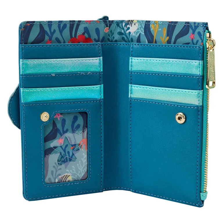 - Loungefly dark blue faux leather snap-closure wallet features Ariel and Flounder with appliqué details and coordinated lining.