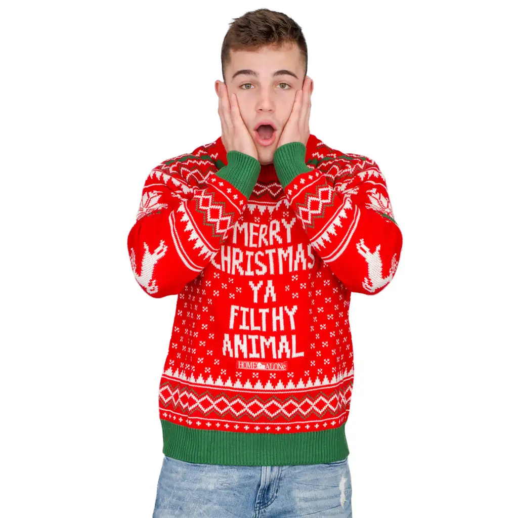 Pay tribute this year to everyone’s favorite Christmas movie, Home Alone. If you love the movie that features the two Wet Bandits chasing after little Kevin after his parents have mistakenly left him behind on Christmas, then you totally get and appreciate the whole “Merry Christmas Ya Filthy Animal” thing here. Wearing this Home Alone movie Merry Christmas Ya Filthy Animal Ugly Christmas sweater is the perfect way to express your love for the Christmas season while at the same time showing home much you love the movie Home Alone — avoid feeling tipsy like one of Santa’s elves.
