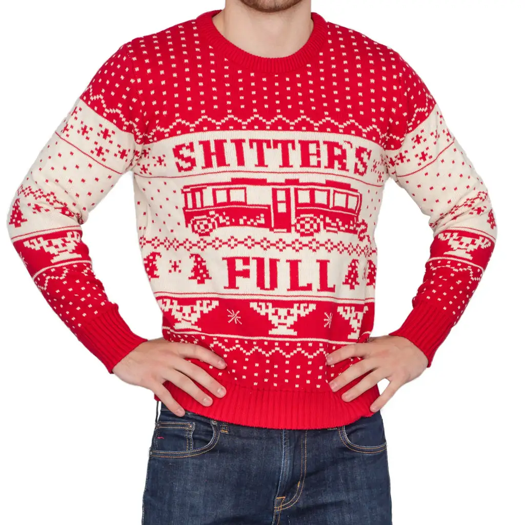 Who doesn’t love Cousin Eddie from National Lampoon’s Vacation and National Lampoon’s Christmas Vacation. Cousin Eddie steals the show in especially the latter, and ‘everyone remembers his funny line “Shitter’s Full.” Now you can gross out your friends with our Shitter’s Full ugly holiday sweater – and make them feel as tipsy as one of Santa’s elves.