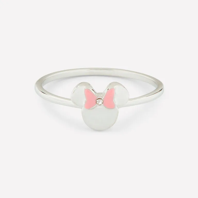 - Pura Vida silver ring features Minnie Mouse design with pink bow and crystal accent.