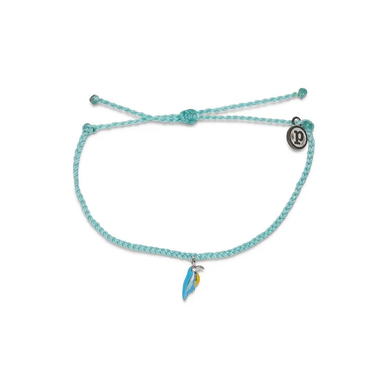 - Pura Vida braided seafoam bracelet features waxed string cord in teal and a tropical bird charm.