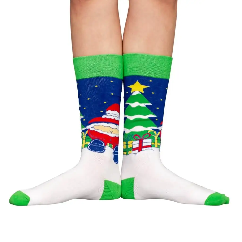 Who ever said that Santa Claus was infallible? This twisted and cheeky pair of funny ugly Christmas socks feature a Santa in mid-crack standing out by the North Pole as he gets ready to board his sleigh and venture out into the good night to deliver the children of the world these Christmas presents. Everyone will appreciate the good-natured idea of having Santa show off his butt crack just when he’s about to go out and stay up all night delivering presents as he’s forced to slide down a small ass chimney for some cheap, grocery store Keebler cookies — and that always makes him feel as tipsy as one of his elves.