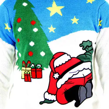 Santa’s being Cheeky with this ugly Christmas sweater, showcasing his butt crack as he delivers Christmas presents under the Christmas tree.