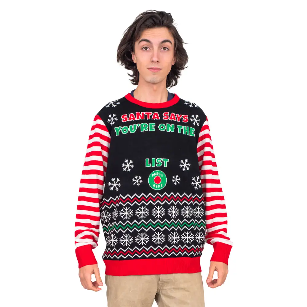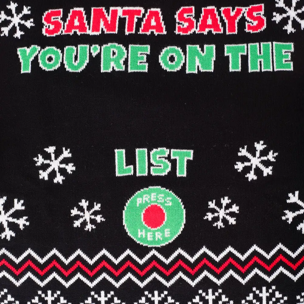 Dress to impress this holiday season – feel as tipsy as one of Santa’s elves while doing it too! If it’s fun you’re looking to create this Christmas, then you should show up to your next holiday party wearing this hilarious, interactive Santa Says LED sweater. Whether your friends or family have been naughty or nice, just have them “push the button” on the sweater and you’ll give them a memory at Christmas time that they’ll never forget. An interactive ugly Christmas sweater makes people the hit of the party just as much as a LED ugly Christmas sweater can draw attention to any wearer that wants to dazzle everyone.