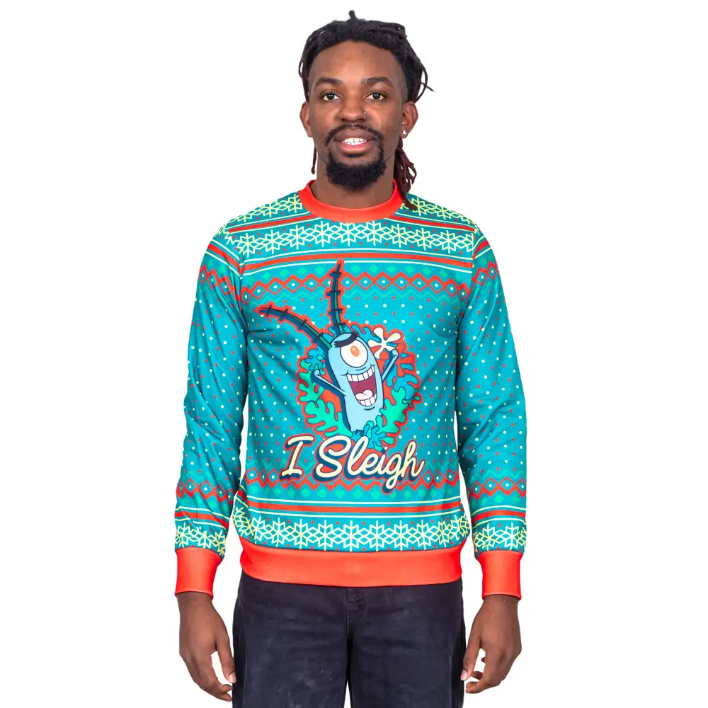 Anyone that tries to always be a kid at heart will appreciate this officially-licensed SpongeBob SquarePants ugly Christmas sweater. Featuring a fun pun, in the spirit of SpongeBob and Patrick, this SpongeBob “I Sleigh” ugly Xmas sweater is so fun, warm, soft, and comfortable that it’s perfect to wear to your next ugly Christmas sweater party with family and friends.