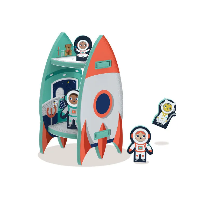 - Foam and paper laminate 3D play puzzle from Storytime Toys features astronauts, a cat and rocket ship pieces.