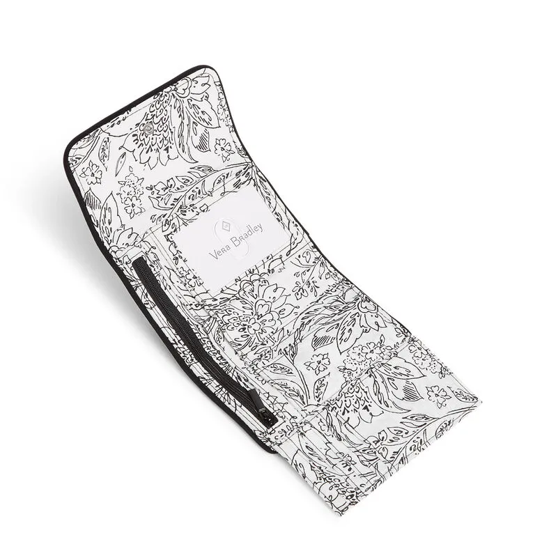 This small but hardworking Vera Bradley wallet keeps your life organized with plenty of interior slips for cash, cards, coins and ID, and two pin-snap closures. Smart technology with worry-free, RFID-blocking liner protects your credit and debit cards from unwanted scans. And it’s as pretty as it is practical in a classic black microfiber fabric with a patterned lining.