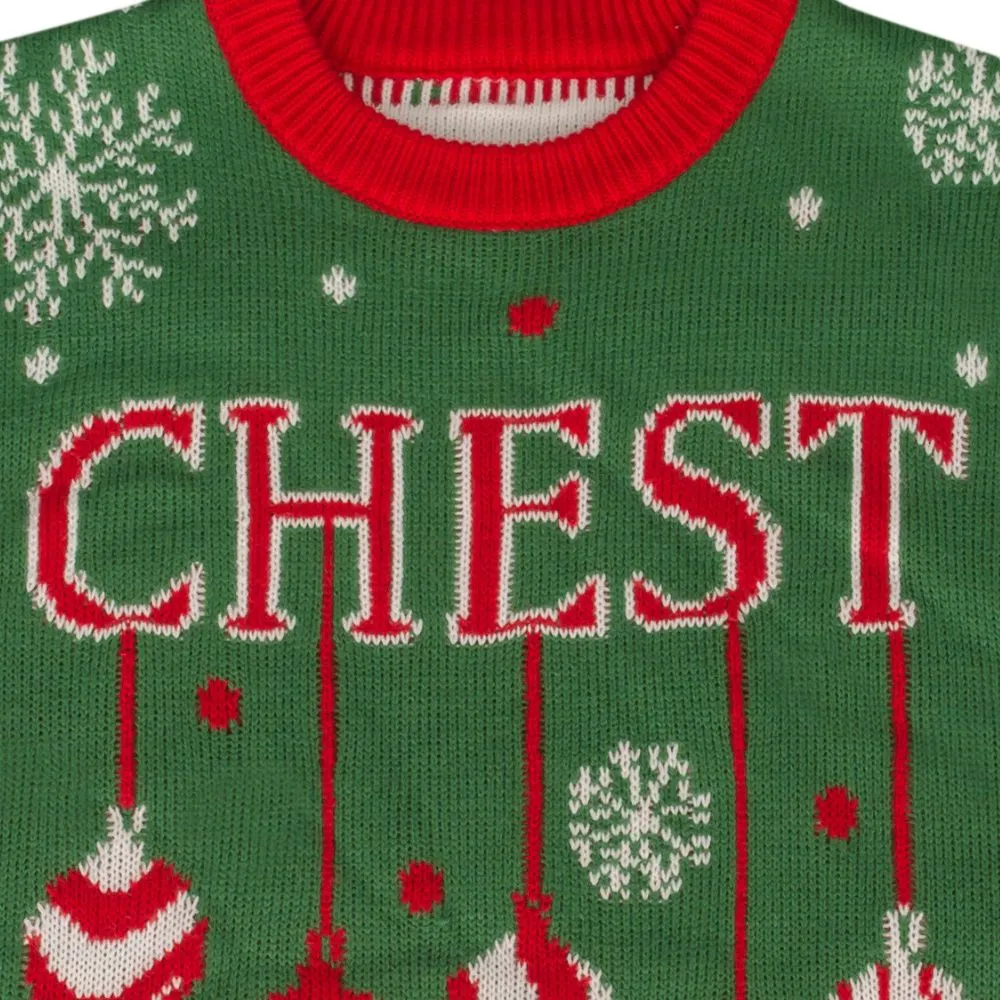 The perfect companion ugly Christmas sweater to our Men’s Nuts Snowflakes Christmas tree ugly Christmas sweater, this Women’s’ Chest Snowflakes Christmas tree ugly Christmas sweater when worn with your significant other can create the ultimate couple’s ugly Christmas sweater gag when you go out on the town during the holidays or to you next friends and family or work ugly Christmas sweater party. Our couple’s ugly Christmas sweaters are perfect to wear when you’ve got to dress to impress during the holiday season and you want to feel that holiday tipsy feeling that Santa’s elves often experience.Â