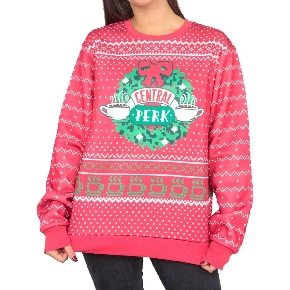 Having a warm, fun, and comfortable ugly Christmas sweater to wear during the holiday season can not only help your attitude about the season but it can also make it enjoyable. Regardless of whether you’re a fan of the hit NBC sitcom Friends, or just fun and goofy ugly Christmas sweaters, this officially licensed Friends Central Perk Wreath Ugly Christmas Sweater can be the perfect holiday gift this year for someone you love or for yourself when you need something to get you into the mood in December — because feeling good means feeling tipsy like Santa’s elves.