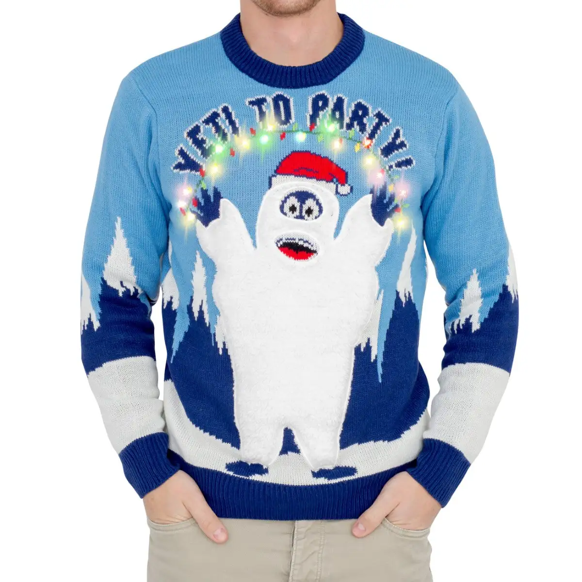Women’s Yeti to Party Light up LED Ugly Sweater Ladies, if you’re looking for a fun and easy way to show off your holiday cheer this season, then why not wear an ugly Christmas sweater. This Women’s ugly Christmas sweater features a cartoon snow Yeti across the front in party-mode. The best part of this ugly holiday sweater is that it features a amusing of LED Christmas tree lights which makes the sweater light up when you wear it. Be the hit of your next holiday party when you show at your next work gathering or friends and family Christmas celebration wearing this hideous Christmas sweater.